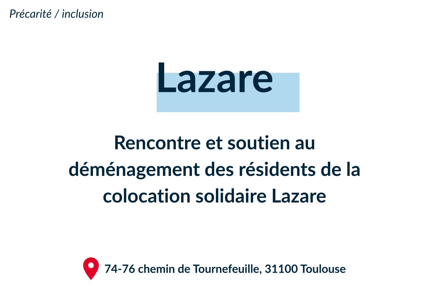 Lazare est une association qui développe des colocations solidaires entre jeunes actifs et personnes ayant vécu dans la rue, pour recréer du lien et favoriser la réinsertion sociale et professionnelle. À Toulouse, la maison accueille plusieurs hommes en précarité, de jeunes actifs ainsi qu’une famille bénévole, dans un cadre convivial avec jardin et potager. C’est un lieu de vie chaleureux, basé sur la simplicité, l’entraide et le partage du quotidien.